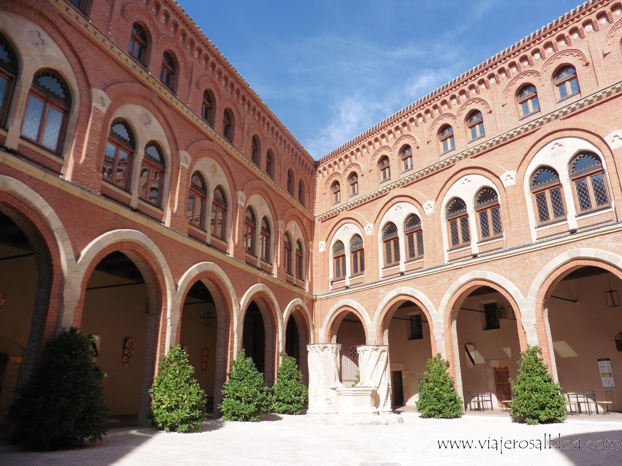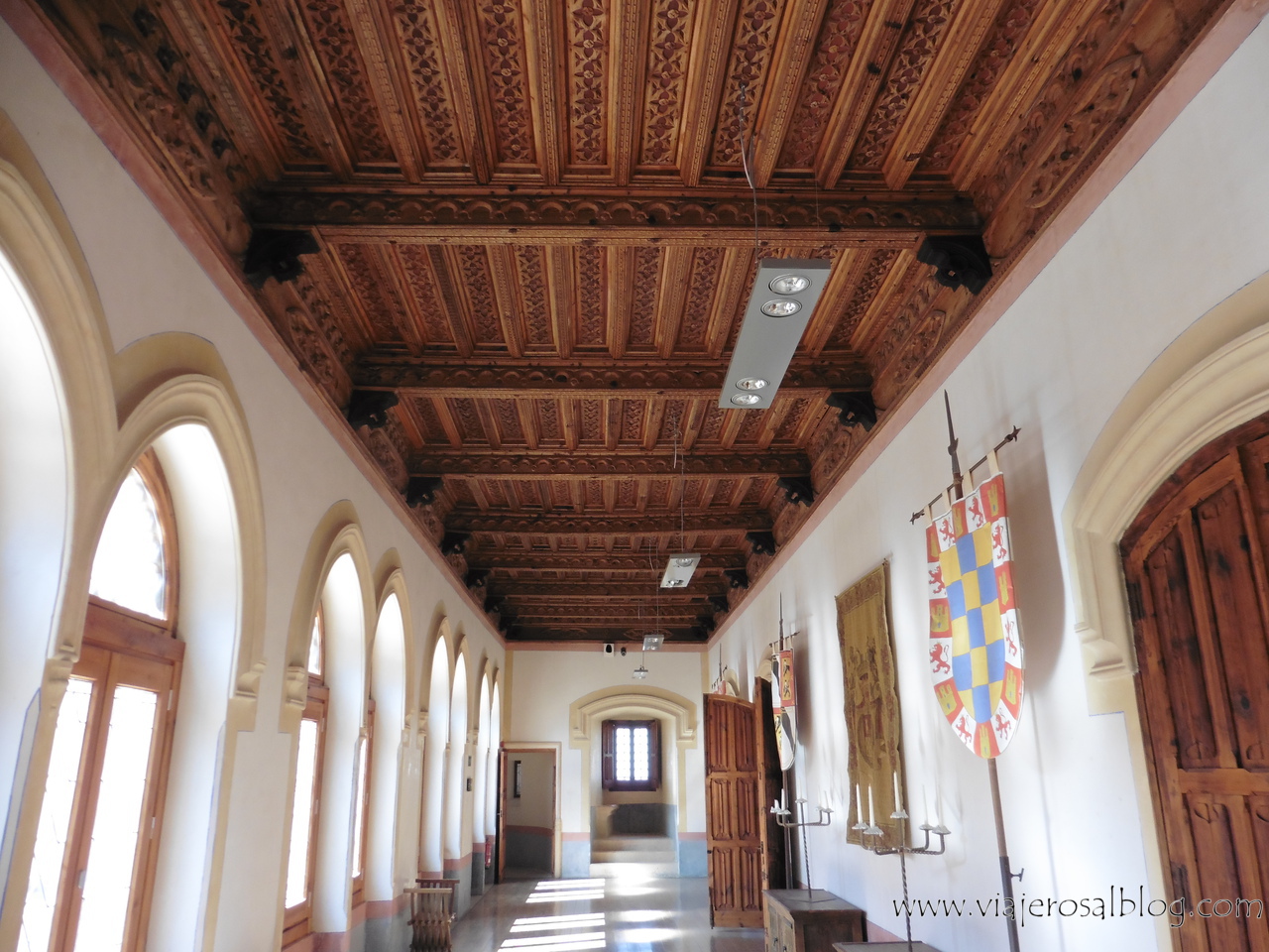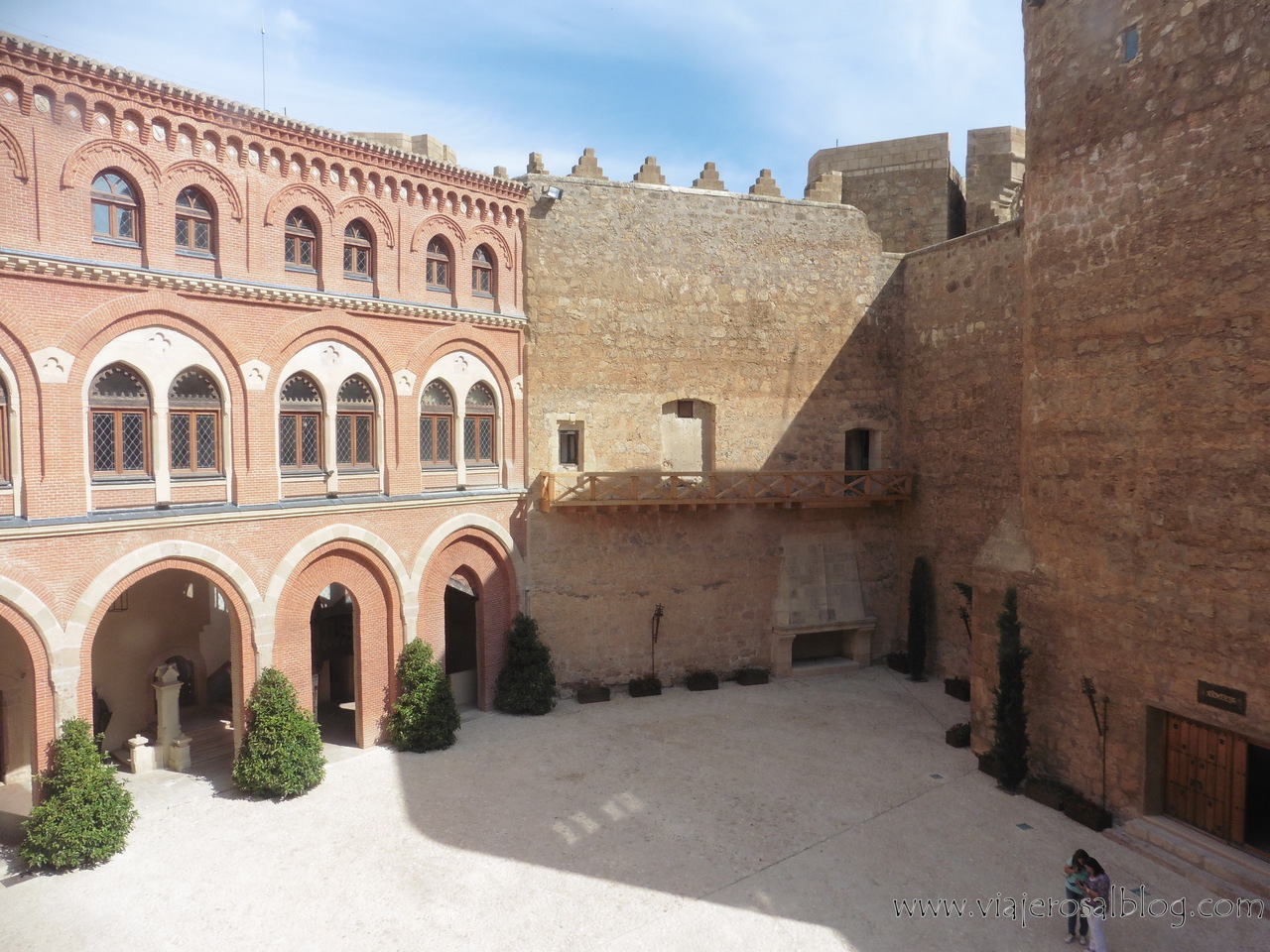 Y ello podemos verlo reflejado… primero, en la totalmente reconocible estructura exterior gótico-mudejar (desde el Patio de Armas es perfectamente visible el contraste como decía, entre fortaleza y palacio a nivel arquitectónico), y segundo; por su interior, tanto bien conservado como perfectamente restaurado, especialmente en lo que a maderas, techos y artesonados se refiere.