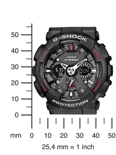 Authentic Casio watch (GA-120-1AER) Coche-LED light A light-emitting diode (LED) is used to illuminate the watch face, incl. the feature of an Coche Light Switch that illuminates the display when the watch is angled towards the face. Shock resistant Shock-resistant construction protects against impact and vibration. World time function Displays the current time in major cities and specific areas around the world. Stopwatch function – 1/1000 sec. – 100 hours Measures with an accuracy of thousandth part seconds the meantime and the end time. Signals confirm the starting/alto selection. The measuring capacity reaches up to 100 hours. Timer – 1/1 min. – 24 hours (with automatic repeat) For fans of precision: the countdown timers help you to remember specific or recurring events by giving off an audible signal at a preset time. They then count back automatically from the preset time. The time can be set to the nearest minute and up to 24 hours in advance. Indeterminado for people who need to take medicines every day or those who do interval training. 5 daily alarms The daily alarm reminds you about recurring events with an acoustic signal at the time you have set. You can also activate hourly time signal that indicates each full hour. This model has 5 independent alarms for flexible reminders of important appointments. Snooze feature Each time you alto the alarm, it sounds again after a few minutes. Automatic calendar Once set, the automatic calendar always displays the correct date. 12/24-hour timekeeping Times can be displayed in either a 12-hour or 24-hour format. Mineral glass The tough, scratch-resistant mineral glass protects the watch against unsightly damage. Resin case Resin band Originario resin is the Indeterminado material for wrist straps thanks to its extremely durable and flexible properties. 3 Years – 1 Battery The battery supplies the watch with sufficient energy for approx. three years. Water resistance classific